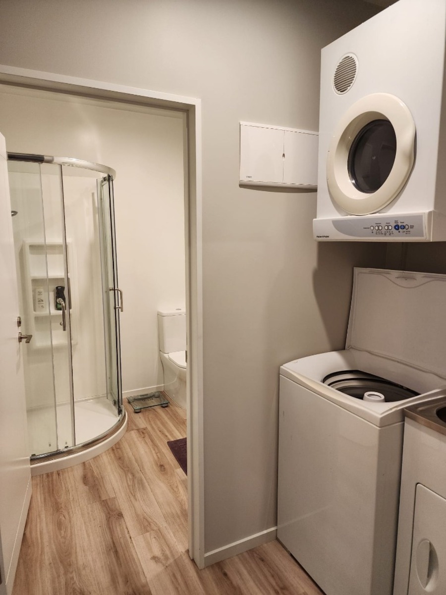 • Upstairs Residential: Modern 2-bedroom unit with bathroom, laundry, open-plan kitchen and lounge, heatpump, and small balcony.