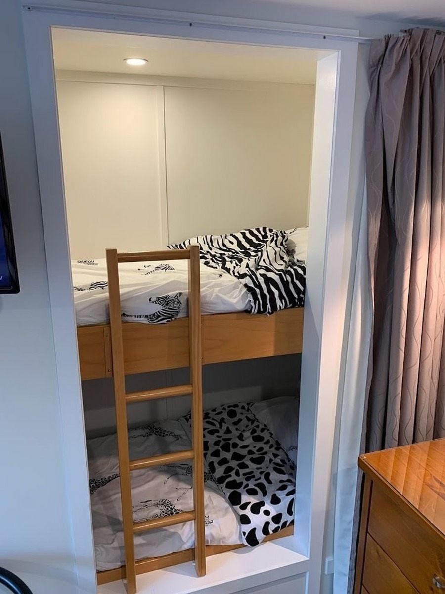 The Queen bedroom has two children's bunks built into the wall. They can be hidden away behind the curtain if not used, or modified to use for storage instead.