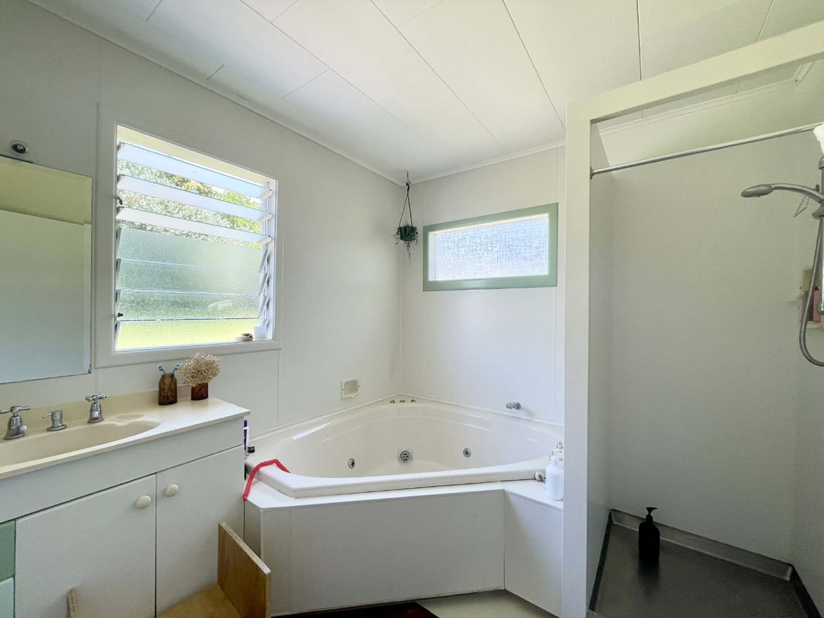 The home offers a warm and inviting lounge, complete with a wood burner for those cooler months, and stunning ocean views that can be enjoyed from the lounge and two of the bedrooms. A functional bathroom features a spa bath and separate shower, while the toilet is located in a separate room for added convenience, ideal for families.