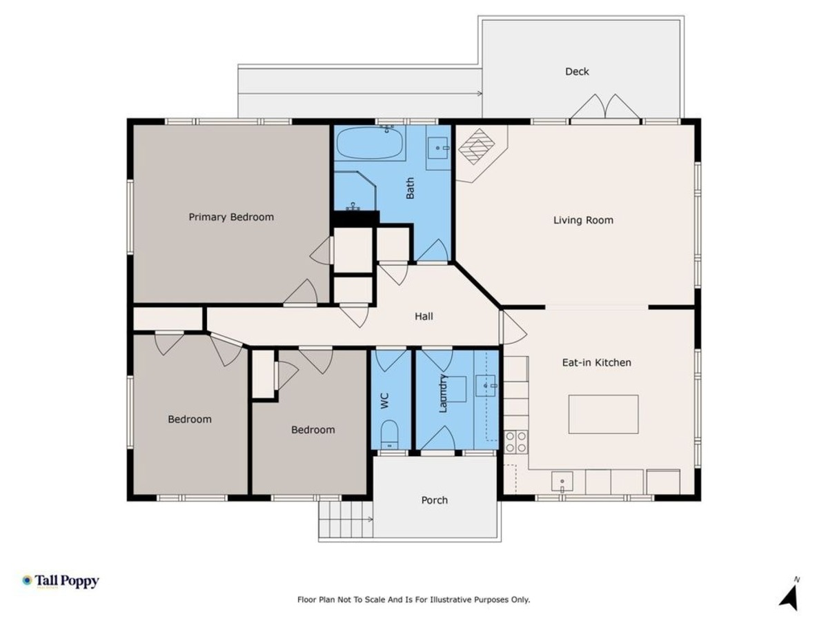 The kitchen boasts an island/breakfast bar, built-in oven with rangehood and splashback. The living area has the wood burner and opens out to the deck basking in the sun. The good-sized bathroom has both shower and bath with a separate toilet. Two bedrooms are double in size and one is single.