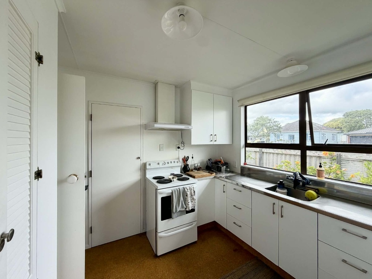 The kitchen is practical and well-equipped with a freestanding stove and rangehood. There are two bedrooms and a bathroom with a corner shower.