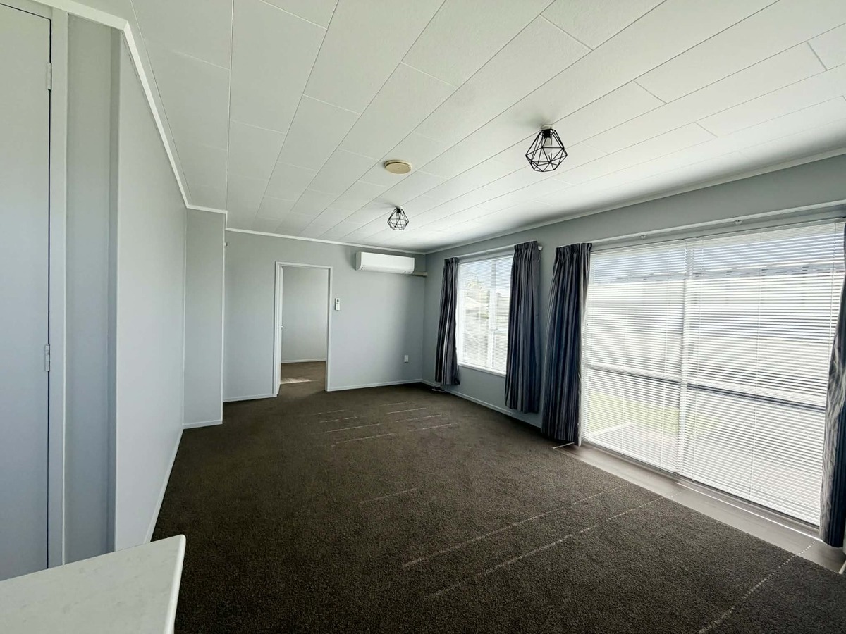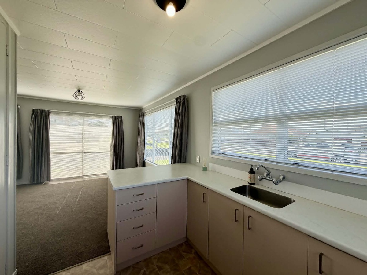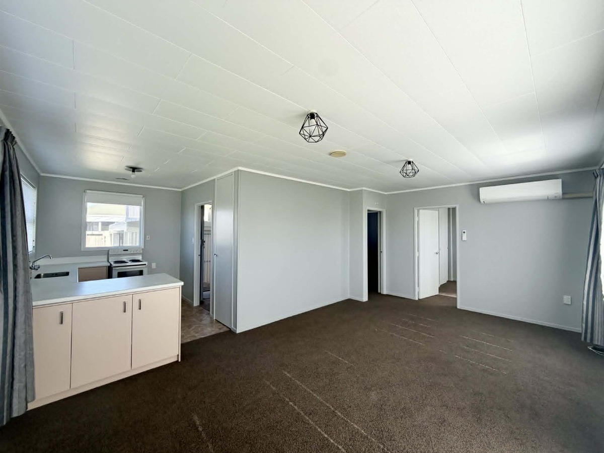 Inside is warmed by a heat pump and the main living is relatively open plan. The kitchen contains a freestanding electric oven and good cupboard storage. Adjacent is the laundry area and hot water is electric. Both bedrooms are double in size with built in wardrobes. The bathroom has an alcove shower unit and corner vanity.