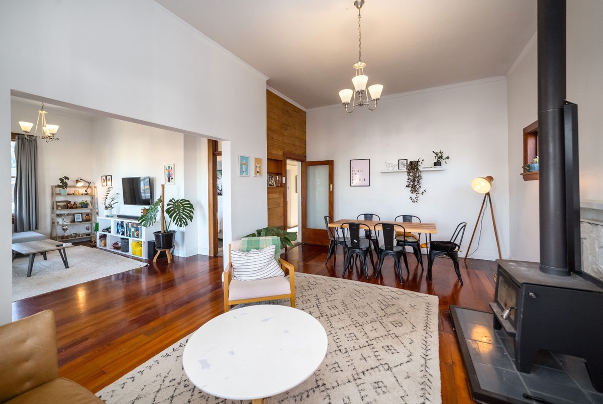 The home features three spacious bedrooms, a modern bathroom with shower and clawfoot bath, a combined laundry, and two separate living areas for flexibility and space. The kitchen includes quality appliances, generous bench space, and a breakfast bar. Heating is covered with a wood burner and a heat pump for year-round comfort.