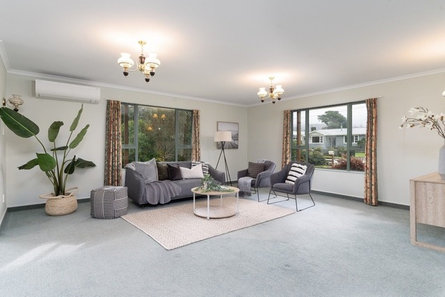 Large, light-filled living room with heat pump and fireplace for year-round comfort